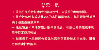 所以問題仍然存在:既然改性水性醇酸樹脂不能達(dá)到溶劑型涂料同樣的性能,為何不直接將傳統(tǒng)型溶劑型樹脂分散在水中呢?直到最近,才得到答案,即傳統(tǒng)溶劑型醇酸樹脂的疏水性太強(qiáng),無法在水中進(jìn)行分散,或者不能保持穩(wěn)定,如醇酸乳液。陶氏公司最新的機(jī)械分散技術(shù)改變了這種規(guī)律,以一種新的方式攻破了這個(gè)難題。機(jī)械分散工藝可以將疏水性極強(qiáng)的醇酸樹脂在無需對聚合物進(jìn)行改性或使用大量表面活性劑的前提下,分散在水中。