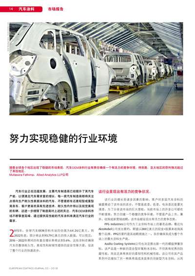 摘要:隨著全球各個地區出現了穩健的市場表現,汽車OEM涂料行業有責任確保一個有活力的競爭環境。特別是,亞太地區的獲利情況超過了其他地區。