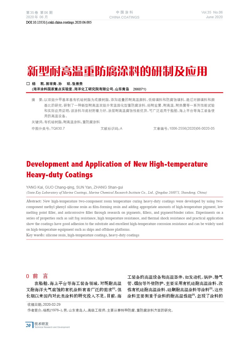 摘要:以雙組分甲基苯基有機硅樹脂為成膜樹脂,添加適量的耐高溫顏料、低熔填料和防腐蝕填料,通過對顏填料和顏基比的研究,研制了一種新型耐高溫雙組分常溫固化型重防腐涂料,經性能試驗和實際應用證明:該涂料與底材附著力好,涂層耐高溫腐蝕性能優異,可廣泛適用于船舶、海上平臺等海工裝備使用的高溫設備。