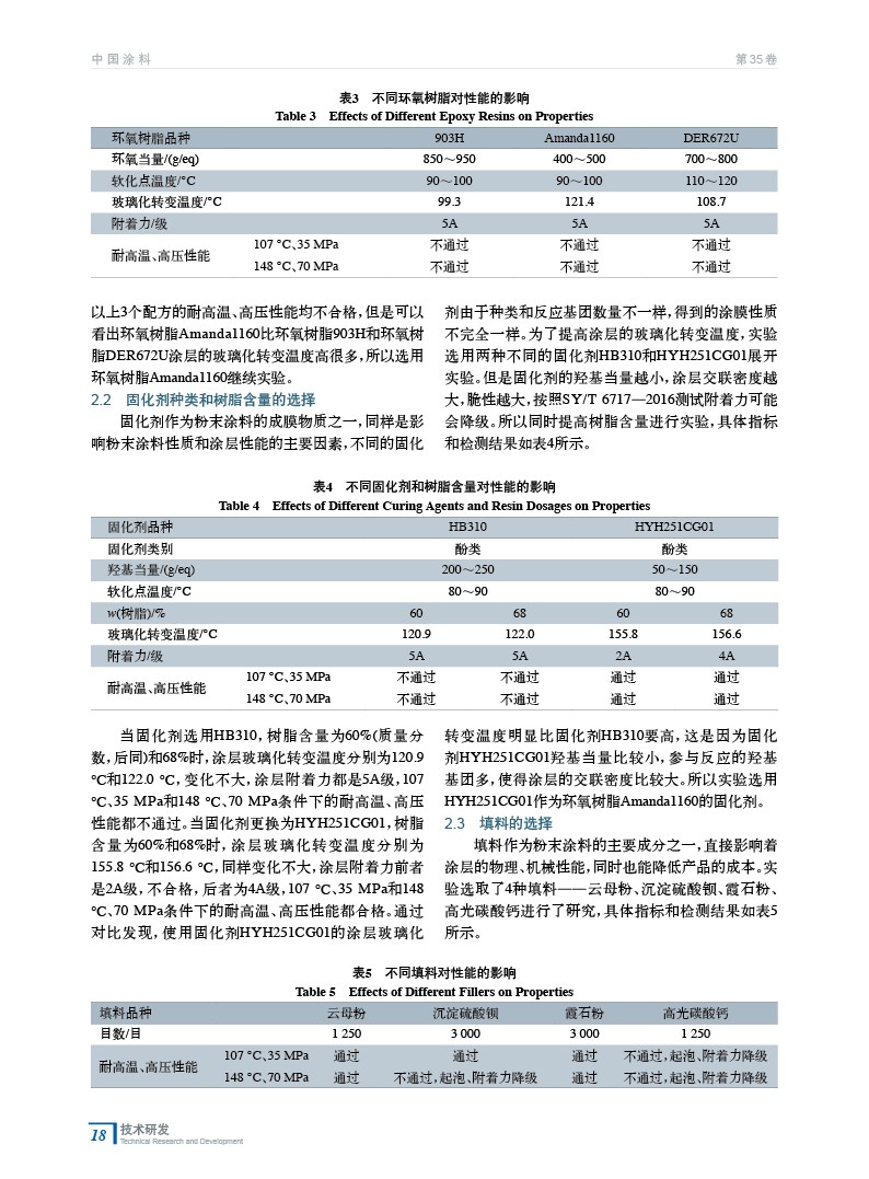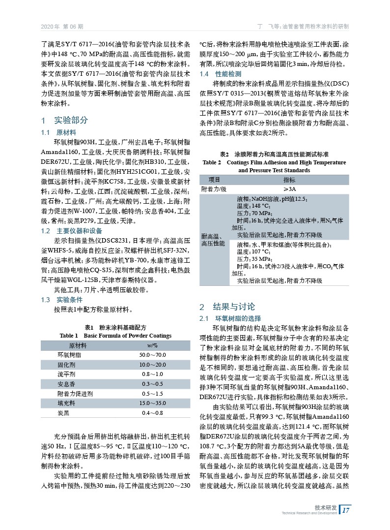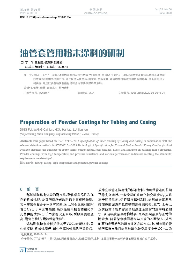 摘要:以SY/T 6717—2016《油管和套管內(nèi)涂層技術(shù)條件》為依據(jù),結(jié)合SY/T 0315—2013《鋼質(zhì)管道熔結(jié)環(huán)氧粉末外涂層技術(shù)規(guī)范》的相關(guān)檢測方法,通過探討環(huán)氧樹脂、固化劑、樹脂含量、填料和助劑等對涂膜性能的影響,從而研制出了耐高溫、高壓以及各項性能指標(biāo)均符合標(biāo)準(zhǔn)要求的粉末涂料。
