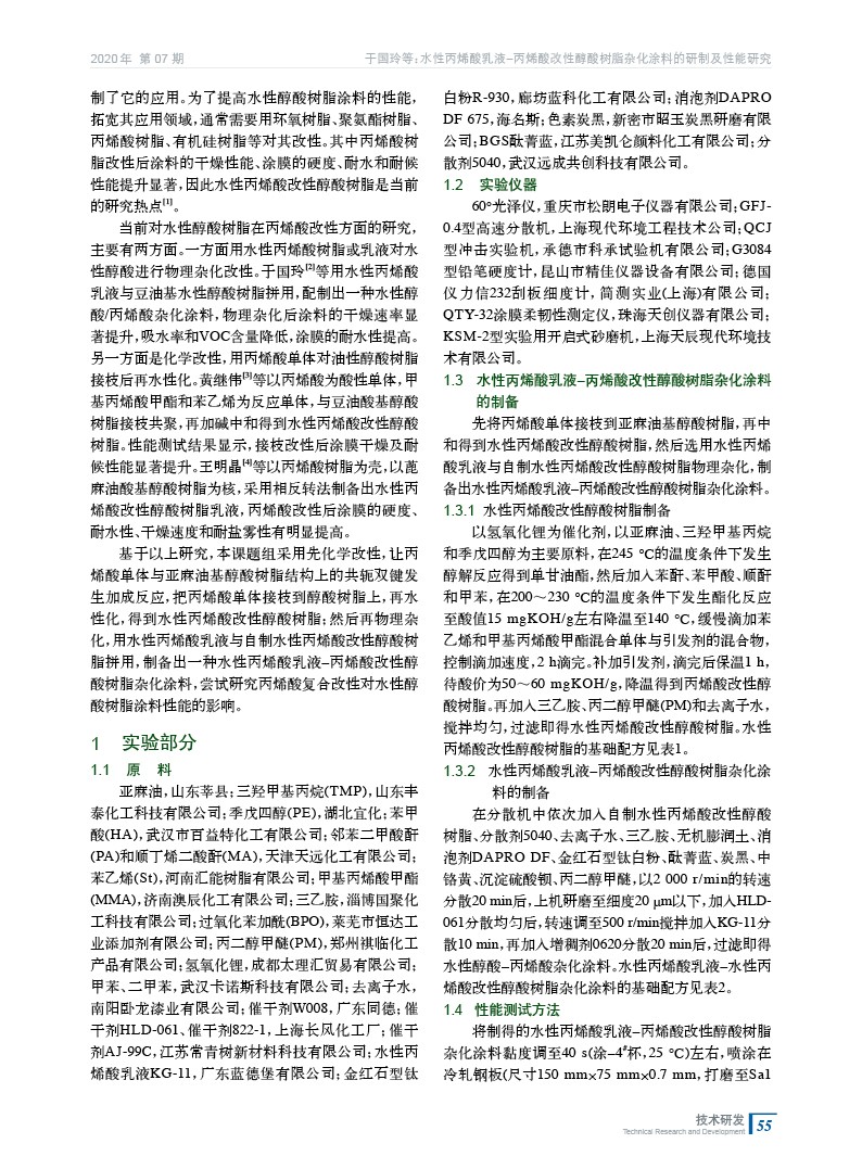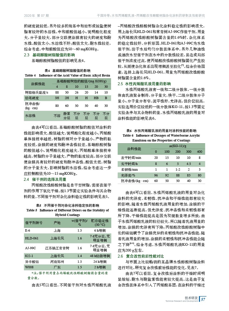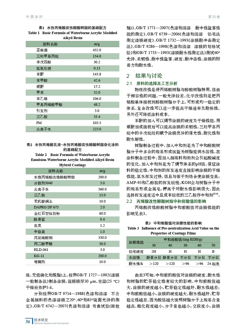 水性丙烯酸乳液?丙烯酸改性醇酸樹脂雜化涂料的研制及性能研究