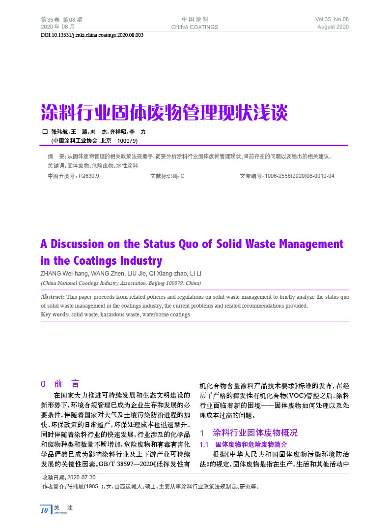 摘要:從固體廢物管理的相關(guān)政策法規(guī)著手,簡要分析涂料行業(yè)固體廢物管理現(xiàn)狀、目前存在的問題以及給出的相關(guān)建議。