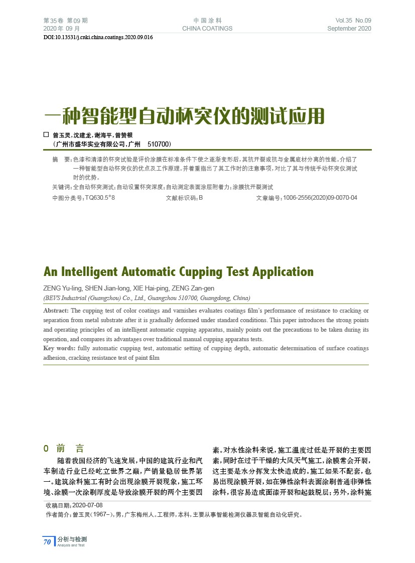 摘要:色漆和清漆的杯突試驗是評價涂膜在標準條件下使之逐漸變形后,其抗開裂或抗與金屬底材分離的性能。介紹了一種智能型自動杯突儀的優(yōu)點及工作原理。并著重指出了其工作時的注意事項,對比了其與傳統(tǒng)手動杯突儀測試時的優(yōu)勢。