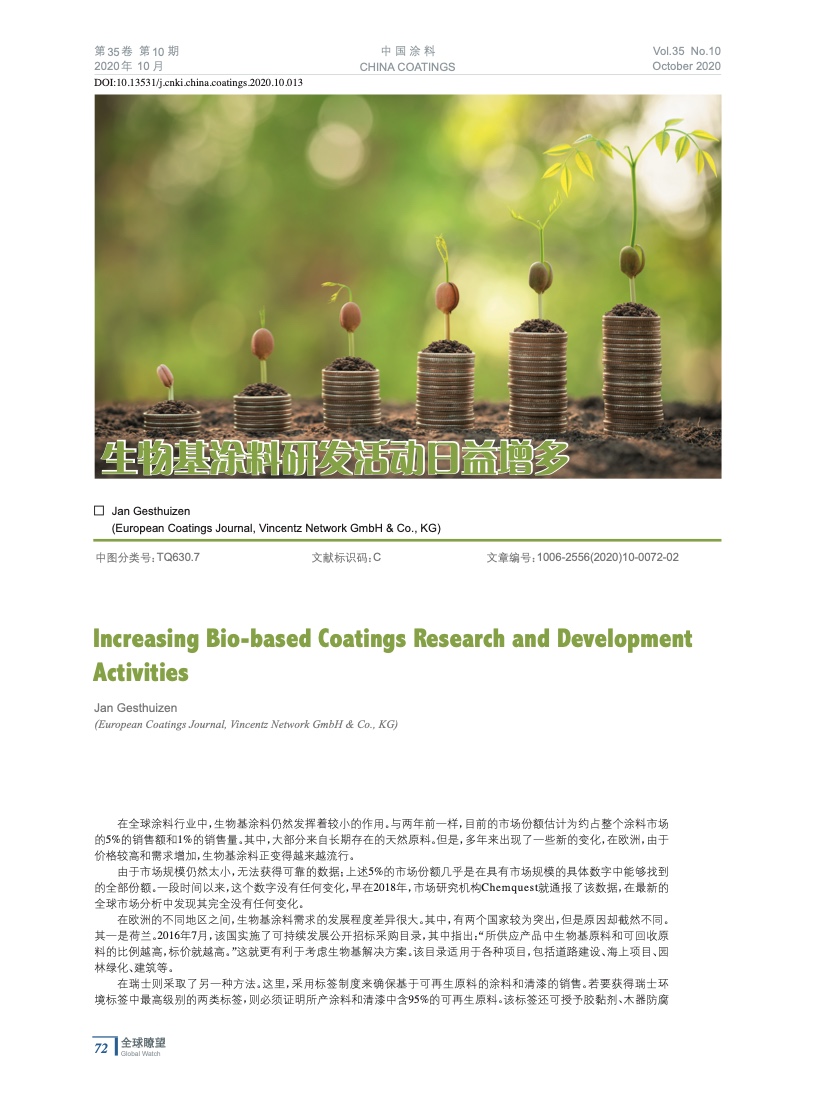 摘要:編者按:在全球涂料行業(yè)中,生物基涂料仍然發(fā)揮著較小的作用。與兩年前一樣,目前的市場份額估計為約占整個涂料市場的5%的銷售額和1%的銷售量。其中,大部分來自長期存在的天然原料。但是,多年來出現(xiàn)了一些新的變化,在歐洲,由于價格較高和需求增加,生物基涂料正變得越來越流行。