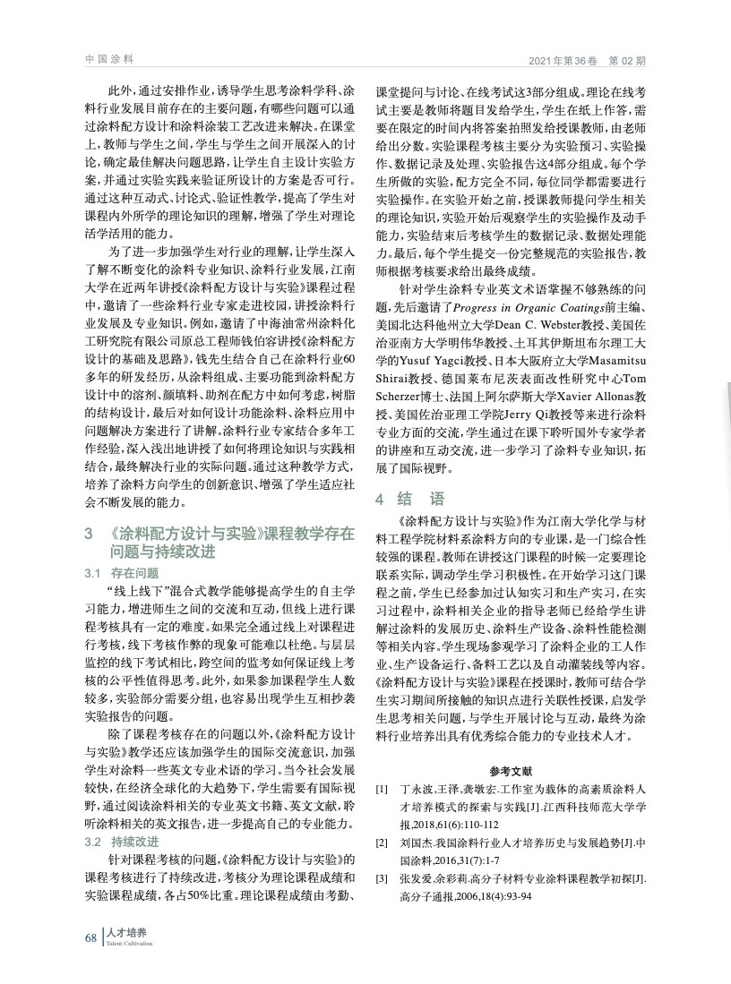 分析了《涂料配方設計與實驗》這門課程的特點及存在的問題,以提高課程教學質量為主要目標,探討新冠疫情背景下引入新的教學模式,如采用“線上線下”混合式教學,并優化課程的教學內容和考核方式,為涂料行業培養更多具有專業知識和實踐能力的高素質人才。