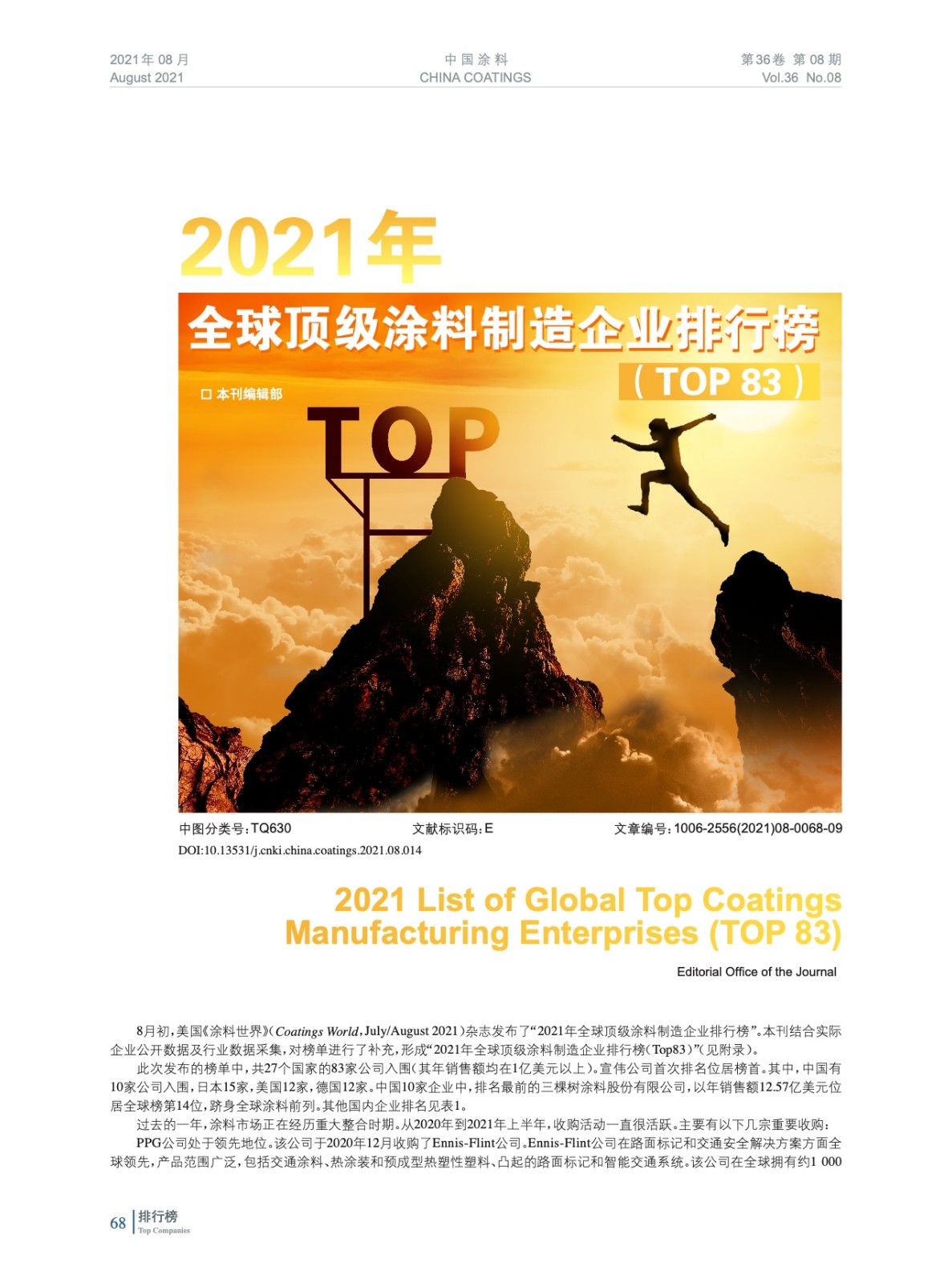 摘要:8月初,美國(guó)《涂料世界》(Coatings World,July/August 2021)雜志發(fā)布了“2021年全球頂級(jí)涂料制造企業(yè)排行榜”。本刊結(jié)合實(shí)際企業(yè)公開數(shù)據(jù)及行業(yè)數(shù)據(jù)采集,對(duì)榜單進(jìn)行了補(bǔ)充,形成“2021年全球頂級(jí)涂料制造企業(yè)排行榜(TOP 83)。