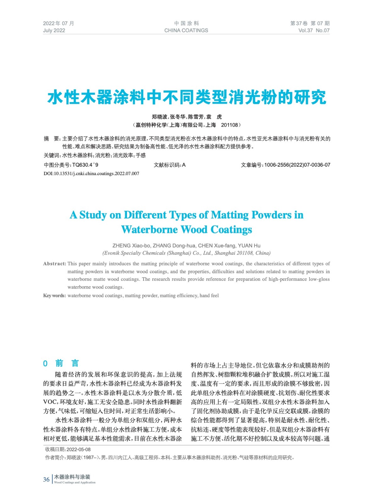 摘要:主要介紹了水性木器涂料的消光原理,不同類(lèi)型消光粉在水性木器涂料中的特點(diǎn),水性亞光木器涂料中與消光粉有關(guān)的性能、難點(diǎn)和解決思路。研究結(jié)果為制備高性能、低光澤的水性木器涂料配方提供參考。