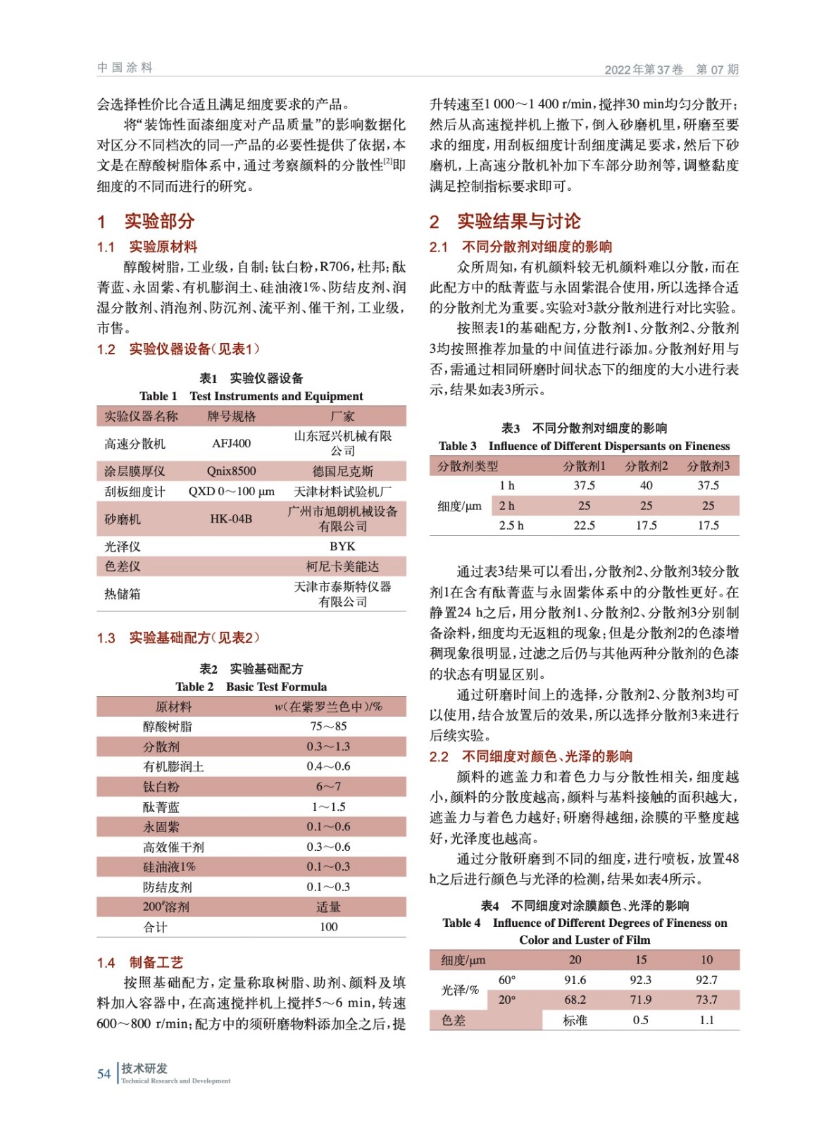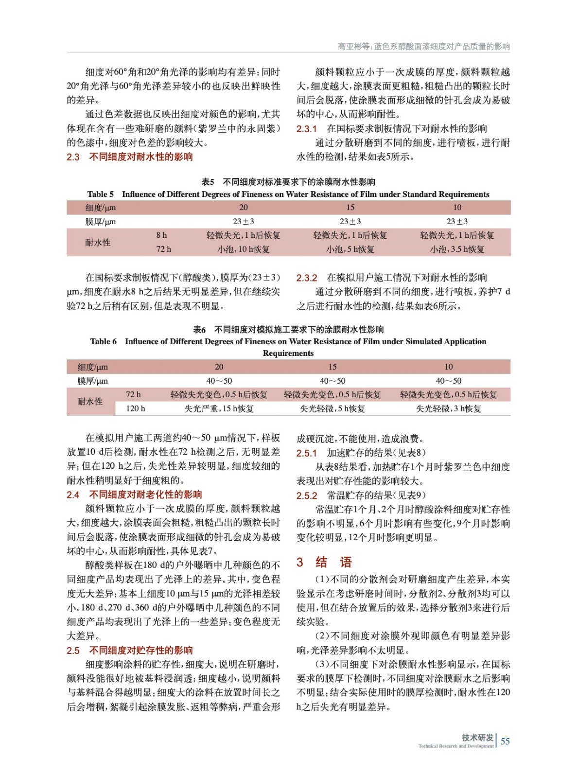 摘要:在醇酸樹脂體系中,考察酞菁藍(lán)、永固紫等顏料的不同分散程度對涂膜的影響,即不同涂料細(xì)度狀態(tài)下,對涂膜顏色、光澤、常溫貯存、加速貯存、耐水性及耐老化性的研究。結(jié)果顯示細(xì)度對涂膜光澤、滿足標(biāo)準(zhǔn)膜厚下的耐水性、耐老化性影響較小,對涂膜顏色、常規(guī)膜厚下的耐水、貯存等影響較大。