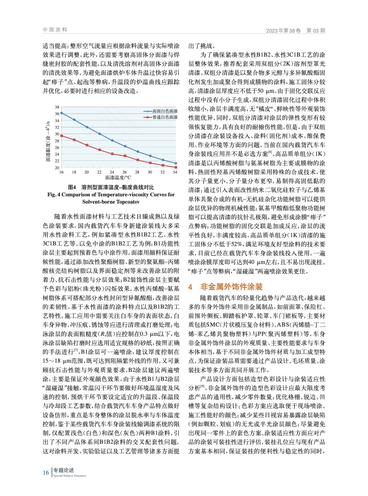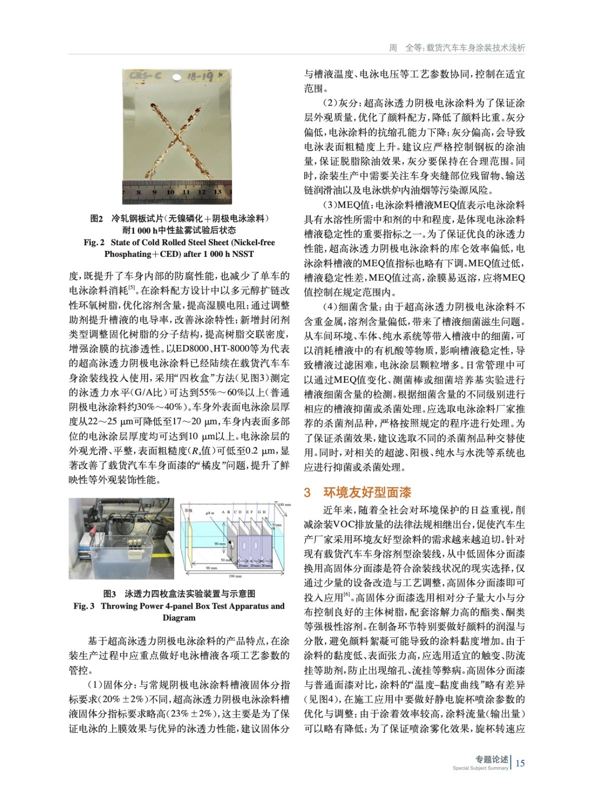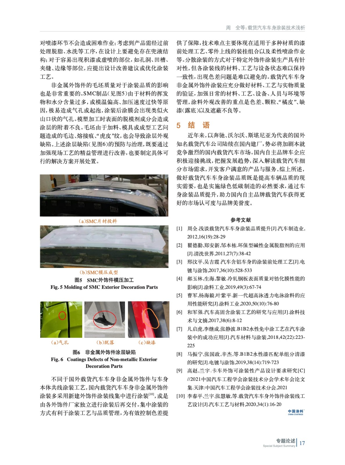 結合國內載貨汽車車身涂裝現狀與發展趨勢,分別從環保型涂裝前處理、超高泳透力陰極電泳涂料、環境友好型面漆以及非金屬外飾件涂裝等方面簡要進行了闡述與分析,并針對載貨汽車車身涂裝品質提升給出了若干技術路徑與改善建議。