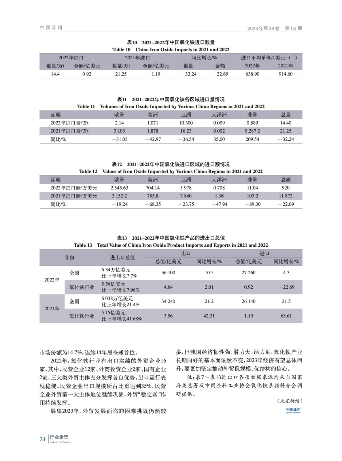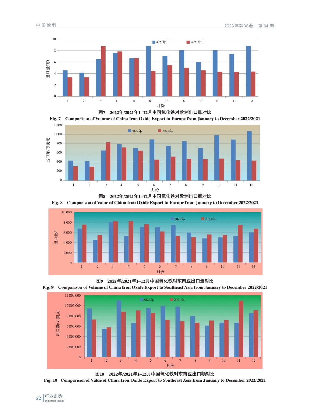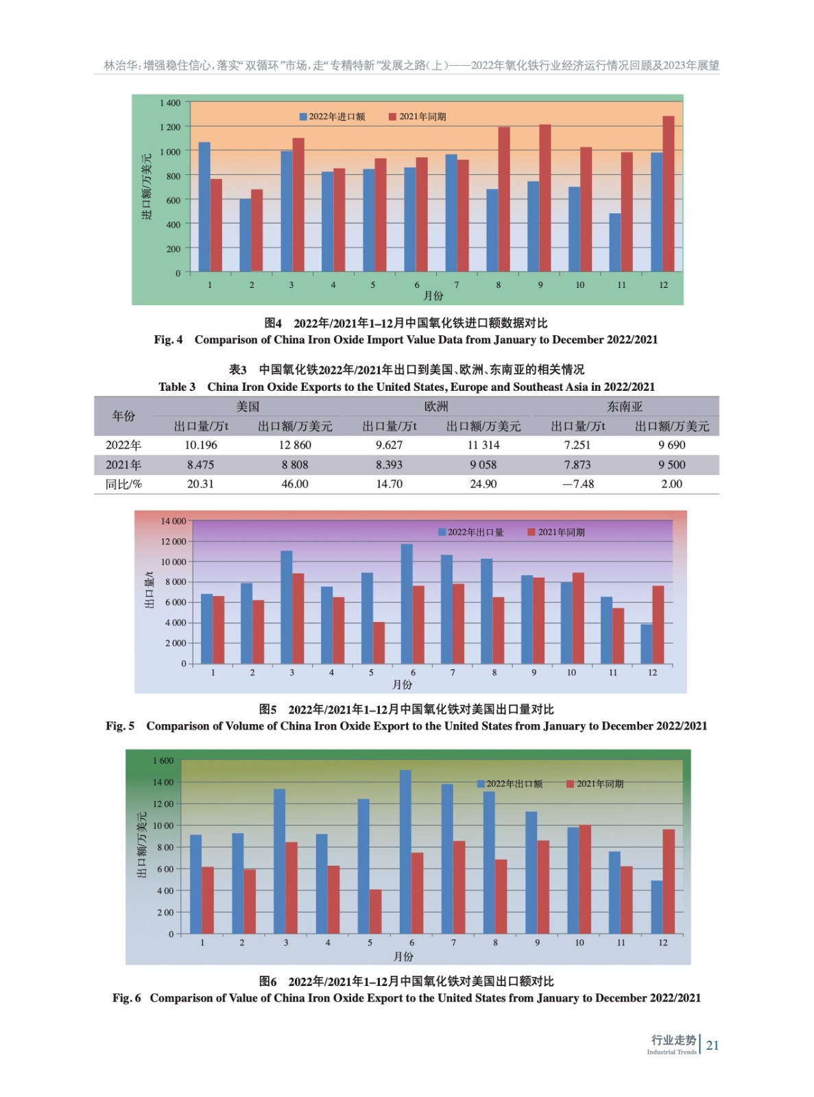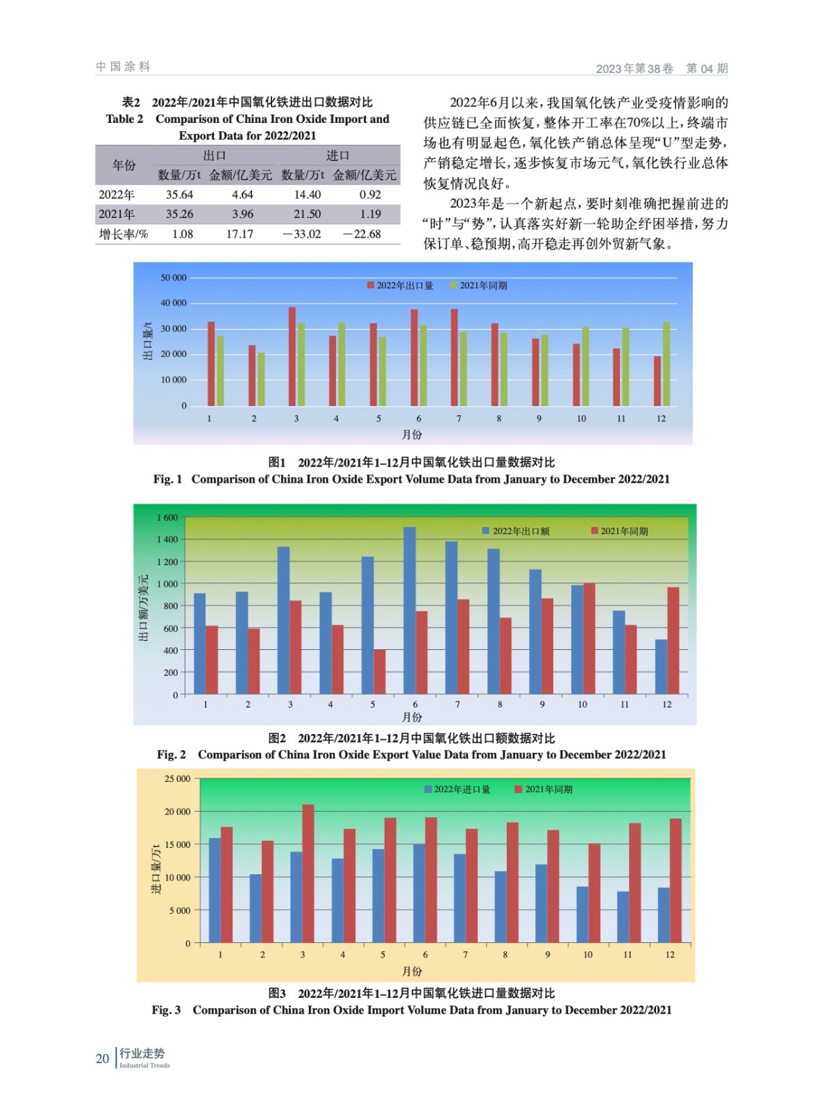 摘要:綜述了2022年中國(guó)氧化鐵行業(yè)所處的經(jīng)濟(jì)環(huán)境,梳理了各項(xiàng)技術(shù)經(jīng)濟(jì)指標(biāo)完成情況、生產(chǎn)營(yíng)銷情況,并對(duì)行業(yè)進(jìn)出口數(shù)據(jù)進(jìn)行了分析,從能耗、標(biāo)準(zhǔn)等回顧了氧化鐵行業(yè)2022年發(fā)展?fàn)顩r,并展望了2023年發(fā)展方向,并指出了行業(yè)發(fā)展方向。
