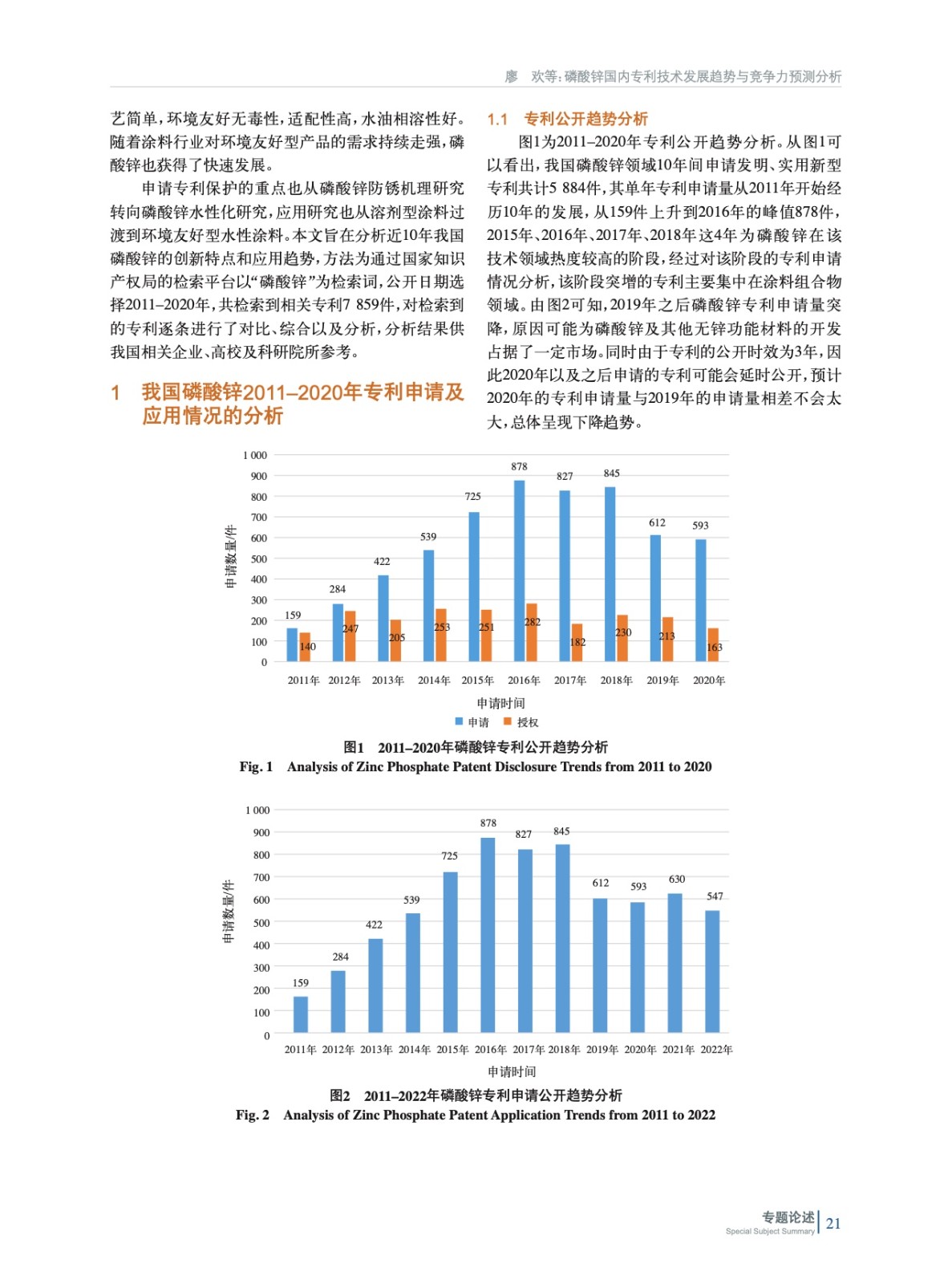 摘要:通過研究我國磷酸鋅申請專利保護的情況,對其自主創新和專利應用的特點進行了全面分析。分析表明,2011–2018年我國磷酸鋅專利申請量上升,2019–2022年開始下降,專利申請類型以發明專利為主,專利保護以磷酸鋅在涂料中的應用(其中主要是抗腐蝕涂料)為主。同時通過對磷酸鋅專利技術發展趨勢與競爭力預測的分析,以及對開發高端磷酸鋅產品的方式和現有專利的運營方式提出了建議。