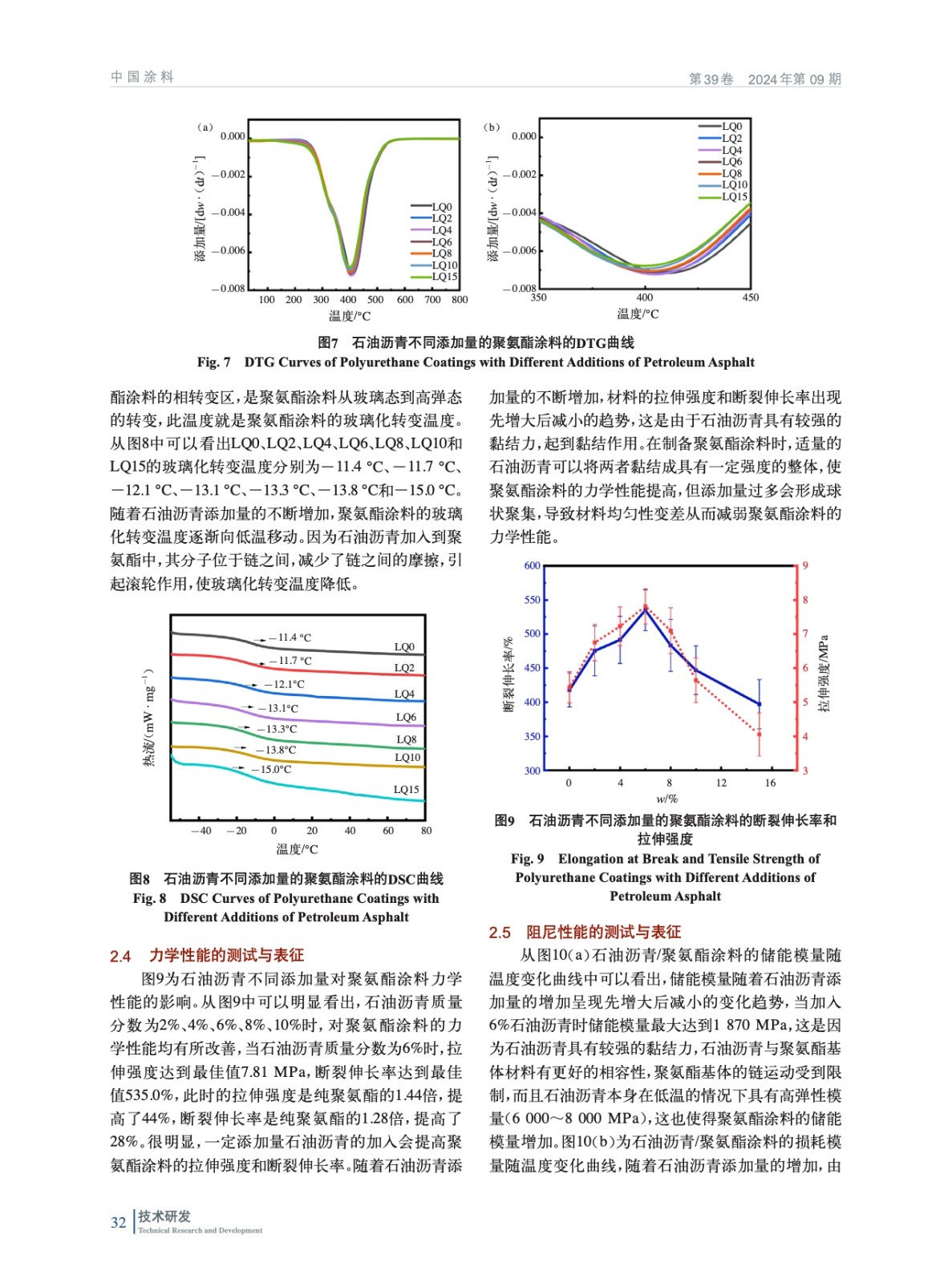 摘要:將石油瀝青作為填料加入聚氨酯涂料中,通過相關測試表征來探究石油瀝青對聚氨酯涂料阻尼性能的影響。測試發(fā)現(xiàn),隨著石油瀝青添加量的增加,涂料的儲能模量、損耗模量以及損耗因子都呈現(xiàn)出先增大后減小的趨勢,當石油瀝青添加量為6%(質(zhì)量分數(shù),后同)時,儲能模量和損耗模量得到提升,同時損耗因子的峰值達到最大為0.94。石油瀝青的加入使聚氨酯涂料的力學性能也得到改善,當石油瀝青添加量為6%時,拉伸強度達到7.81 MPa,是純聚氨酯涂料的1.44倍;斷裂伸長率達到535.0%,是純聚氨酯涂料的1.28倍。