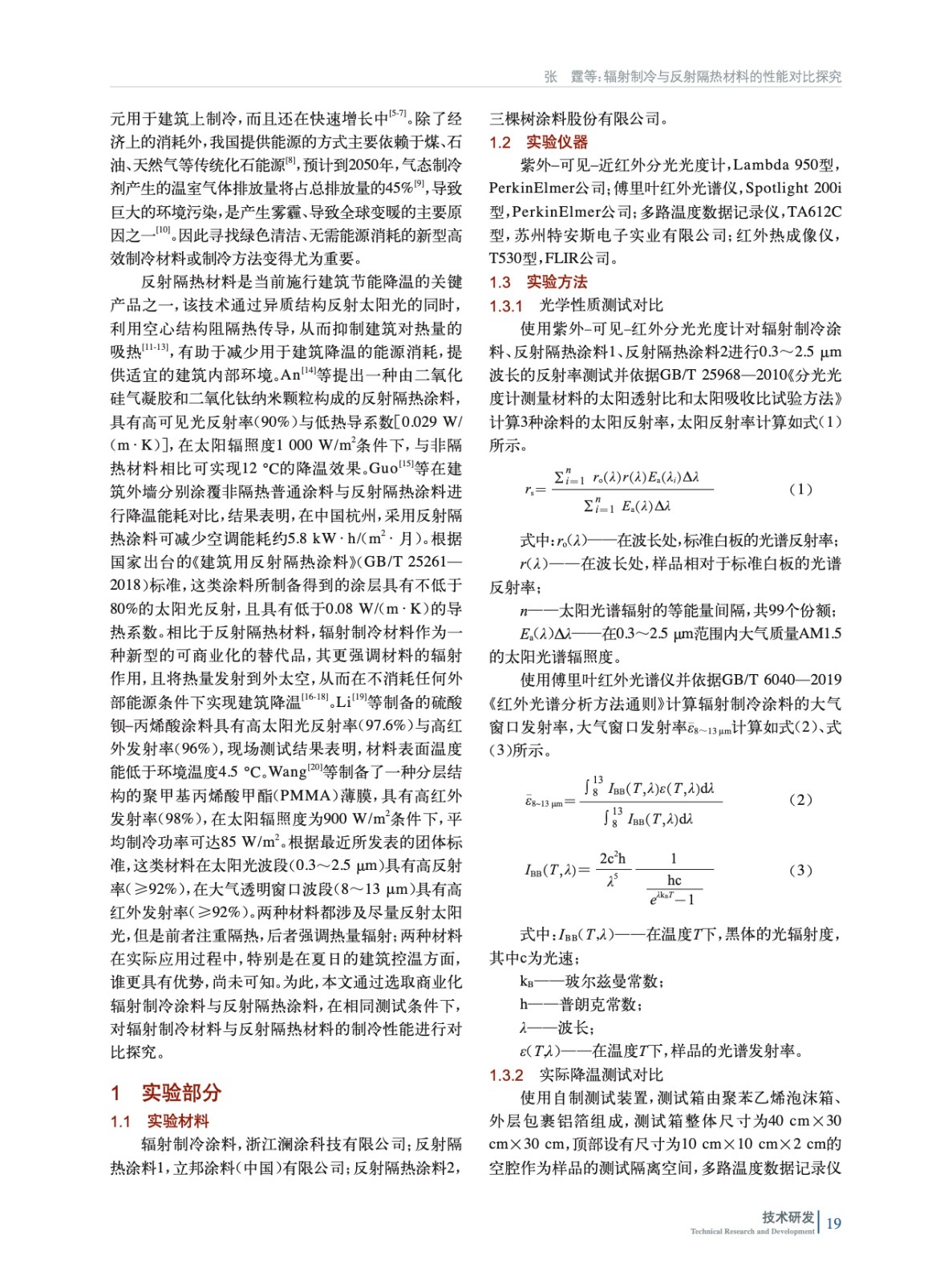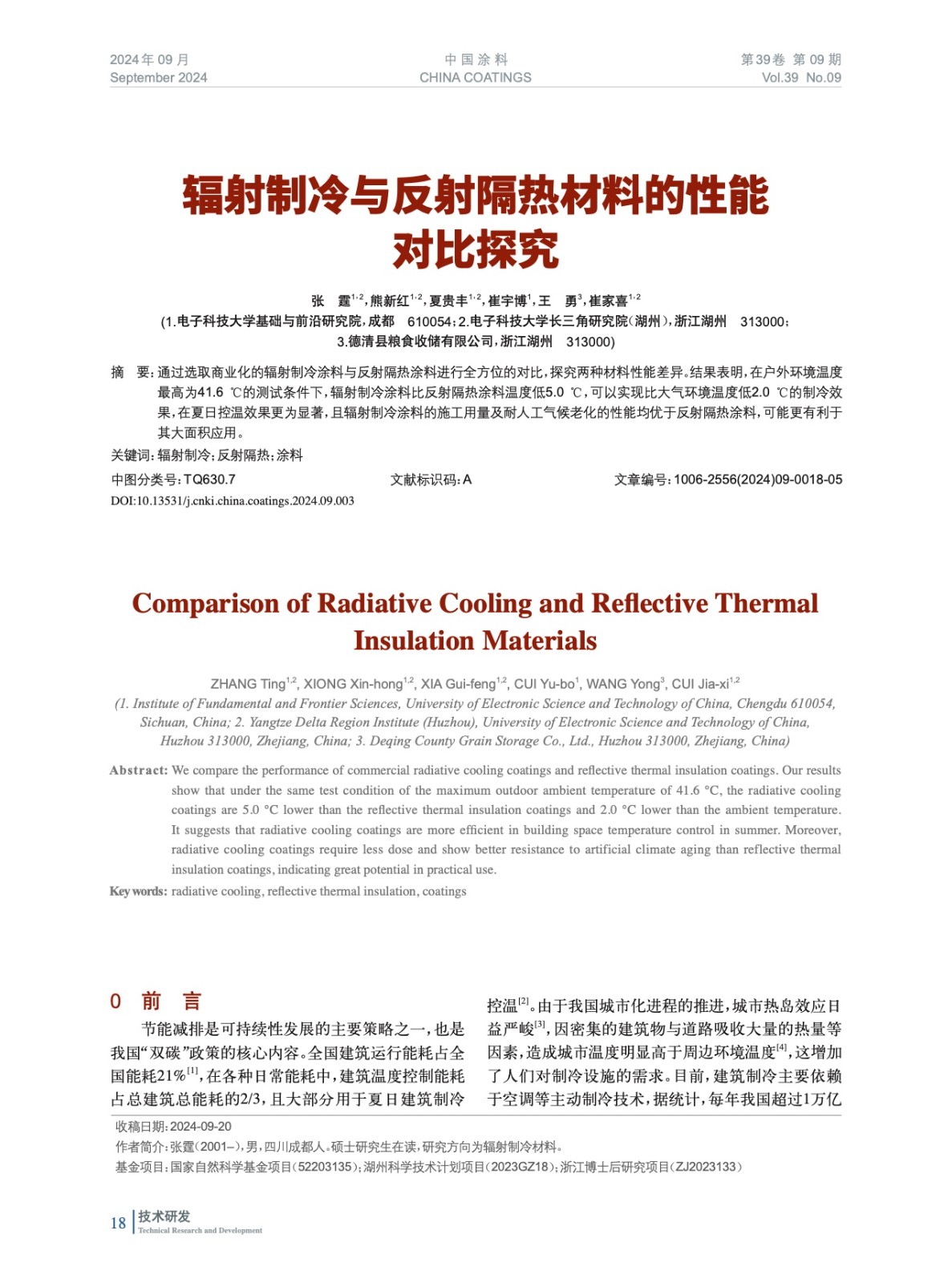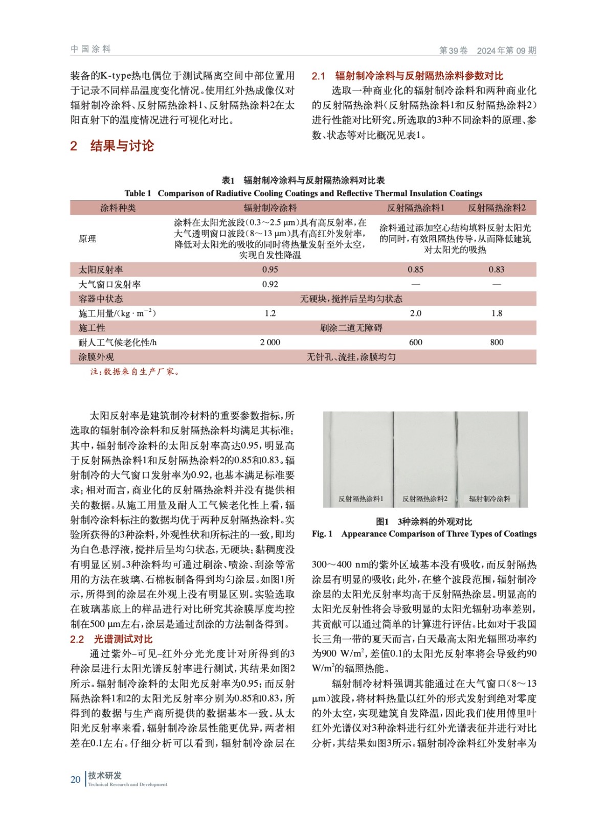 摘要:通過選取商業化的輻射制冷涂料與反射隔熱涂料進行全方位的對比,探究兩種材料性能差異。結果表明,在戶外環境溫度最高為41.6 ℃的測試條件下,輻射制冷涂料比反射隔熱涂料溫度低5.0 ℃,可以實現比大氣環境溫度低2.0 ℃的制冷效 果,在夏日控溫效果更為顯著,且輻射制冷涂料的施工用量及耐人工氣候老化的性能均優于反射隔熱涂料,可能更有利于其大面積應用。