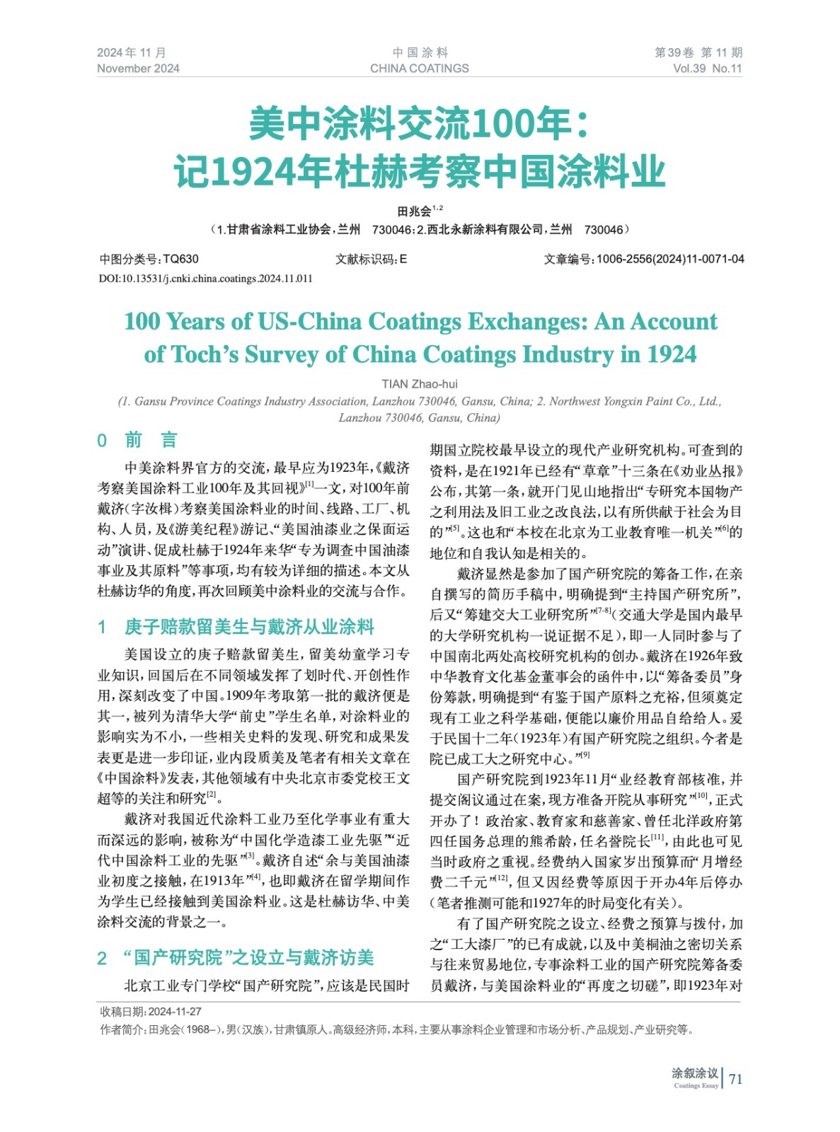摘要:編者按:中美涂料界官方的交流,最早應為1923年,《戴濟考察美國涂料工業100年及其回視》一文,對100年前戴濟(字汝楫)考察美國涂料業的時間、線路、工廠、機構、人員,及《游美紀程》游記、“美國油漆業之保面運動”演講、促成杜赫于1924年來華“專為調查中國油漆事業及其原料”等事項,均有較為詳細的描述。本文從杜赫訪華的角度,再次回顧美中涂料業的交流與合作。