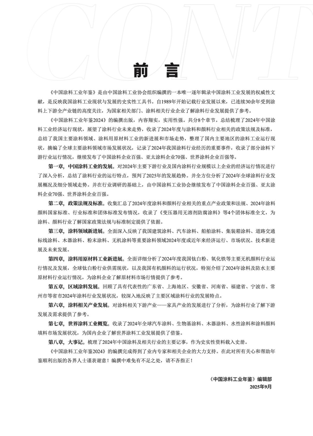 《中國涂料工業年鑒2024》的編撰完成得到了業內專家和相關企業的大力支持。在此對所有關心和幫助年鑒順利出版的各界人士謹表謝意!編撰中難免有不足之處,請不吝指正!