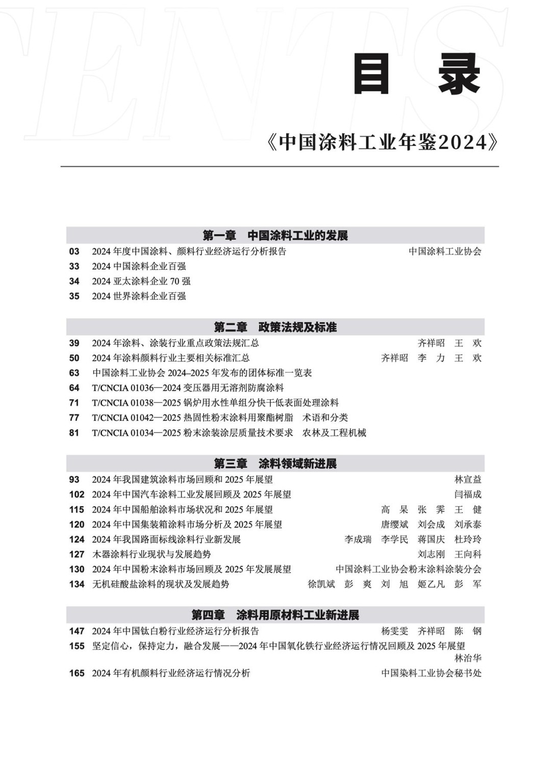 第二章,政策法規及標準。收集匯總了2024年度涂料和顏料行業相關的重點產業政策和法規、2024年涂料顏料國家標準、行業標準和團體標準發布情況,收錄了《變壓器用無溶劑防腐涂料》等4個團體標準全文,為涂料、顏料行業了解國家政策法規與標準制定提供了依據。