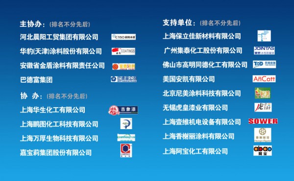 本次會議得到了河北晨陽工貿集團有限公司、華豹(天津)涂料股份有限公司、安徽省金盾涂料有限責任公司、巴德富集團、上海華生化工有限公司、上海鵬圖化工科技有限公司、上海萬厚生物科技有限公司、嘉寶莉集團股份有限公司、上海保立佳新材料有限公司、廣州集泰化工股份有限公司、佛山市高明同德化工有限公司、美國安凱有限公司、北京尼美涂料科技有限公司、上海壹維機電設備有限公司、上海香榭麗涂料有限公司、上海阿寶化工有限公司、山西亮龍涂料有限公司的大力支持。
