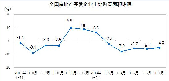 1-7月份,房地產(chǎn)開發(fā)企業(yè)土地購(gòu)置面積17824萬(wàn)平方米,同比下降4.8%,降幅比1-6月份收窄1個(gè)百分點(diǎn);土地成交價(jià)款4828億元,增長(zhǎng)9.8%,增速提高0.8個(gè)百分點(diǎn)。