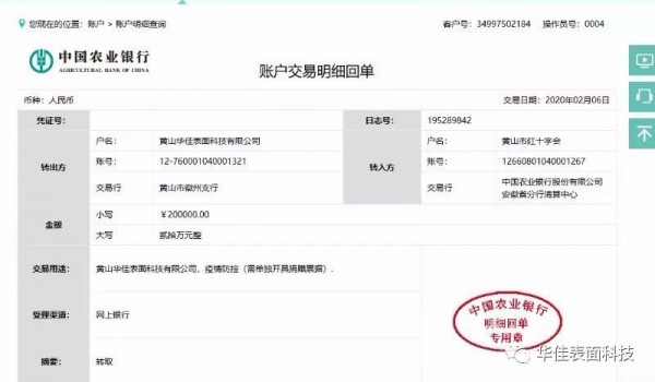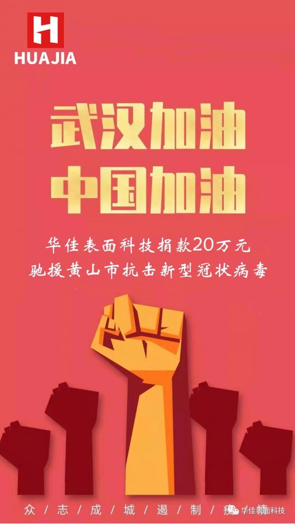 2020年2月6日,華佳表面科技通過黃山市紅十字會捐贈20萬元,將專項(xiàng)用于抗擊新型冠狀病毒感染肺炎疫情防控工作,助力打贏疫情防控阻擊戰(zhàn)。