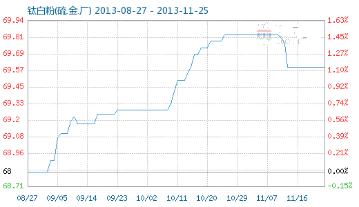 11月24日鈦白粉(硫.金.廠)商品指數為69.60,與11月23日持平,較周期內最高點100.00點(2011-09-04)下降了30.40%,較2013年08月25日最低點68.74點上漲了1.25%。