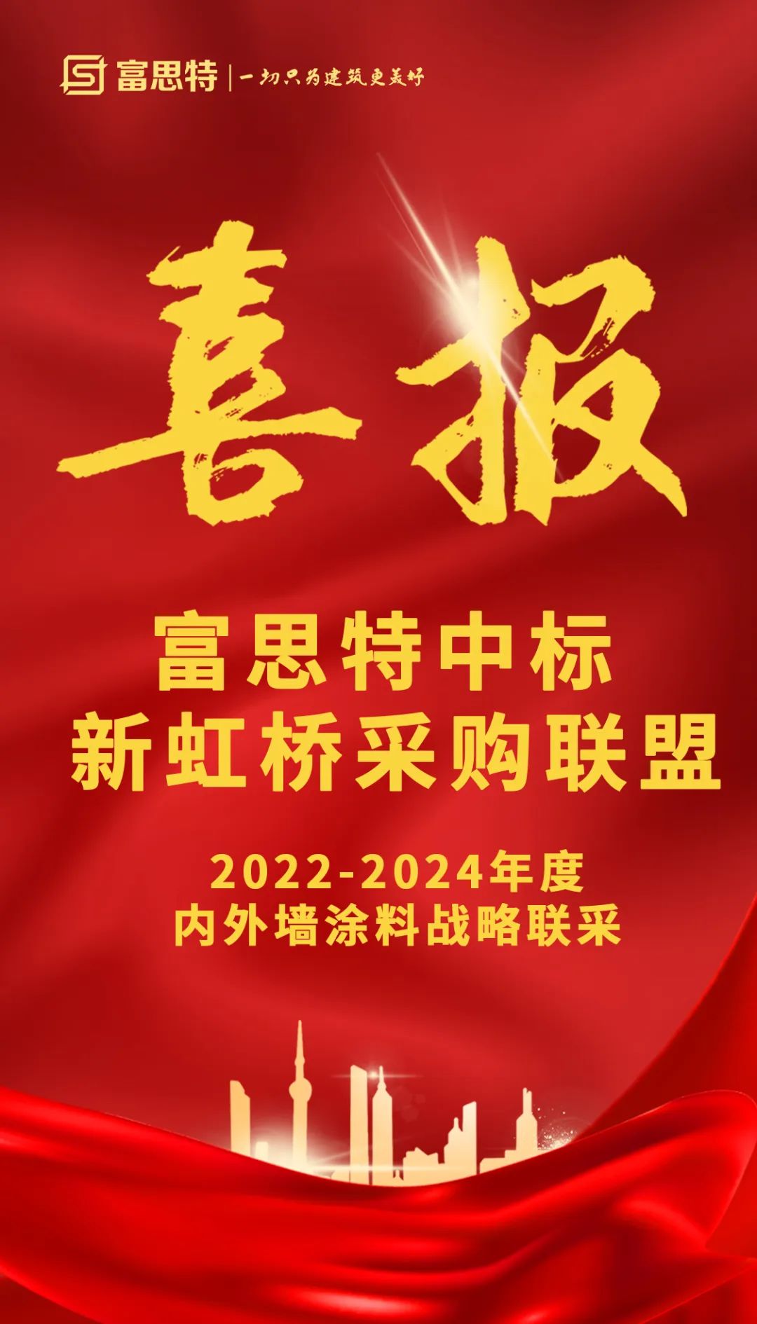 近日又傳捷報(bào),新虹橋采購聯(lián)盟(簡稱“新虹聯(lián)”)公布內(nèi)外墻涂料聯(lián)采中標(biāo)結(jié)果。富思特憑借強(qiáng)大的綜合實(shí)力連續(xù)成功中標(biāo)2022-2024年度新虹聯(lián)內(nèi)墻、外墻涂料戰(zhàn)略聯(lián)采項(xiàng)目。