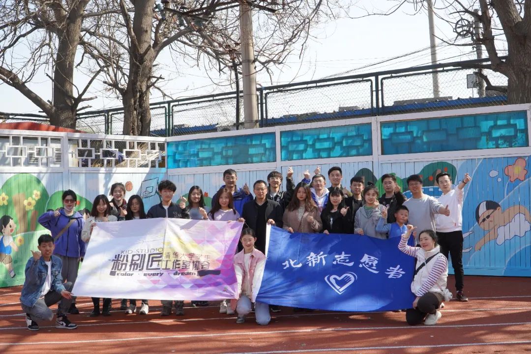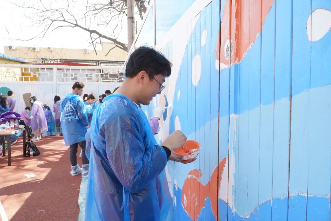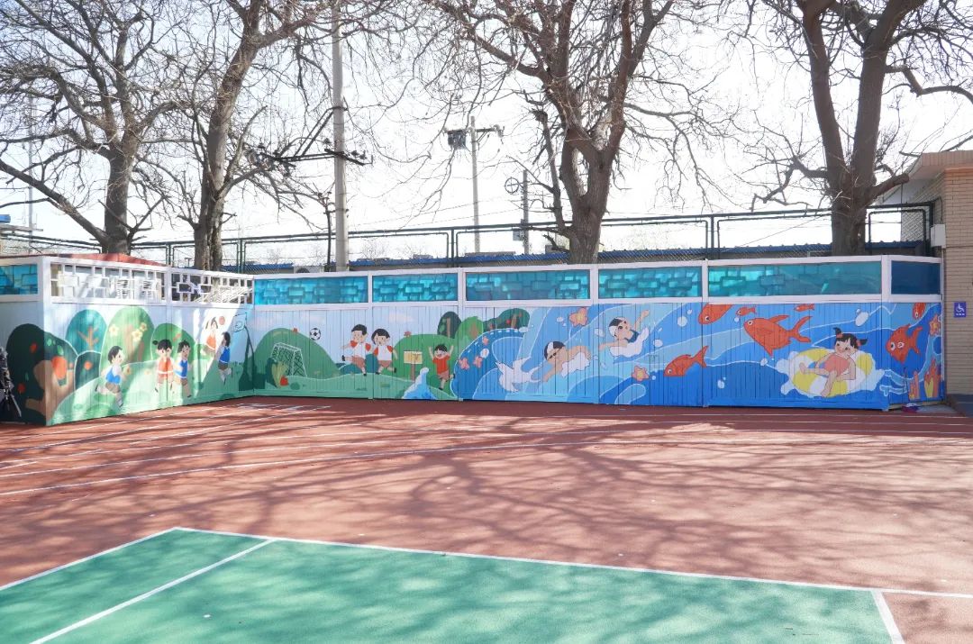 2022年4月3日,在北新建材團委的籌劃組織下,旗下“青春北新”志愿者服務總隊聯合清華大學“粉刷匠”工作室來到學校,開展公益性美化粉刷活動,選用色彩豐富、健康環保的“龍牌漆”對操場四周的墻面進行美化。綠色的草坪、飛翔的鴿子、自由的魚兒、快樂玩耍的小朋友……一幅幅色彩亮麗的畫作躍然墻上。歷經粉刷改造的操場充滿了盎然生機,成為學校一道靚麗的風景線。