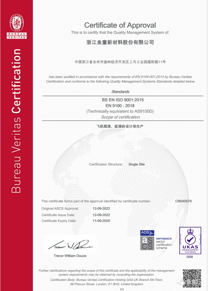 2022年9月,魚童取得了法國BV公司的AS 9100D航空航天裝備質(zhì)量管理體系認(rèn)證證書,標(biāo)志著魚童正式進(jìn)入航空涂料賽道并獲得了國際公司的認(rèn)可。該標(biāo)準(zhǔn)是在ISO 9001質(zhì)量體系要求基礎(chǔ)上開發(fā)的航空航天裝備質(zhì)量管理標(biāo)準(zhǔn),其評(píng)價(jià)內(nèi)容多、章節(jié)細(xì)分標(biāo)準(zhǔn)高、實(shí)施過程嚴(yán)格、難度大;該體系認(rèn)證得到了包括空客、波音、通用電氣等主要航空制造商的認(rèn)可、支持與廣泛應(yīng)用。