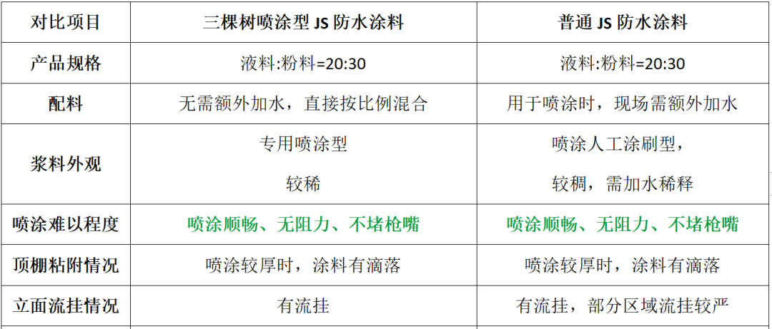 市面上普通JS用于現場噴涂,需要額外加水稀釋,而現場加水難以控制量,影響組分配比,間接影響成膜效果。三棵樹防水推出的新型SGW102PT噴涂型聚合物水泥防水涂料(JSⅡ)施工前無需另外加水,解決了由于現場施工無法控制配比的問題,保留防水涂料自身的水乳比例。產品采用機械噴涂施工,固化后形成致密、高強、堅韌、耐久的彈性涂膜防水層。