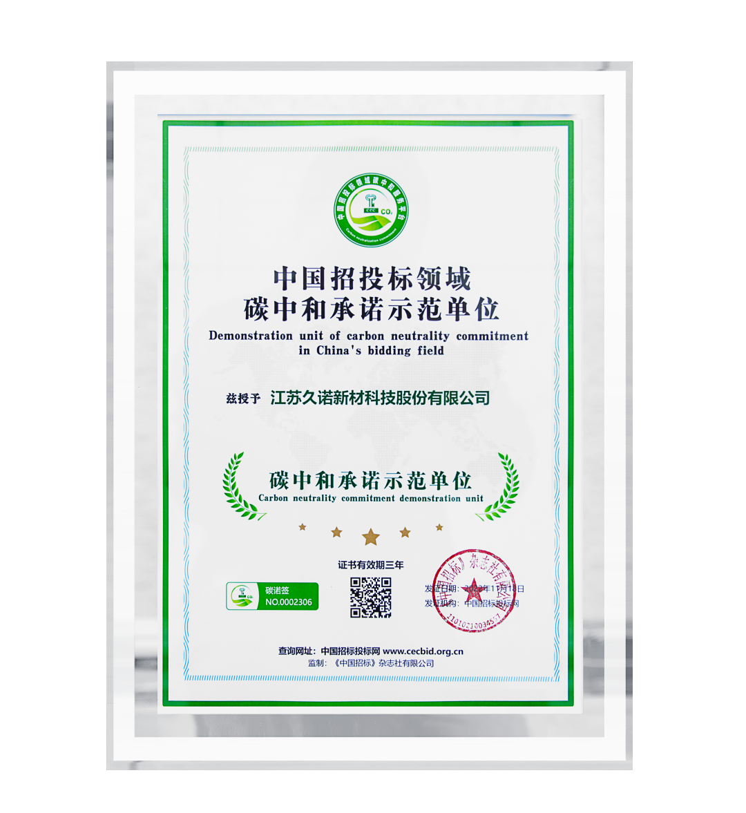 本次久諾榮獲中國招投標領域“碳中和承諾示范單位”,同時獲得了獨一無二的碳諾標簽NO.0002306,將在久諾后期投標項目中提升企業中標幾率,標志著久諾向招投標市場邁向關鍵且重要的一步,成功跨越了工程對接的巨大屏障,將更有利地參與到建設領域中來,助力全社會全行業的綠色建筑發展。