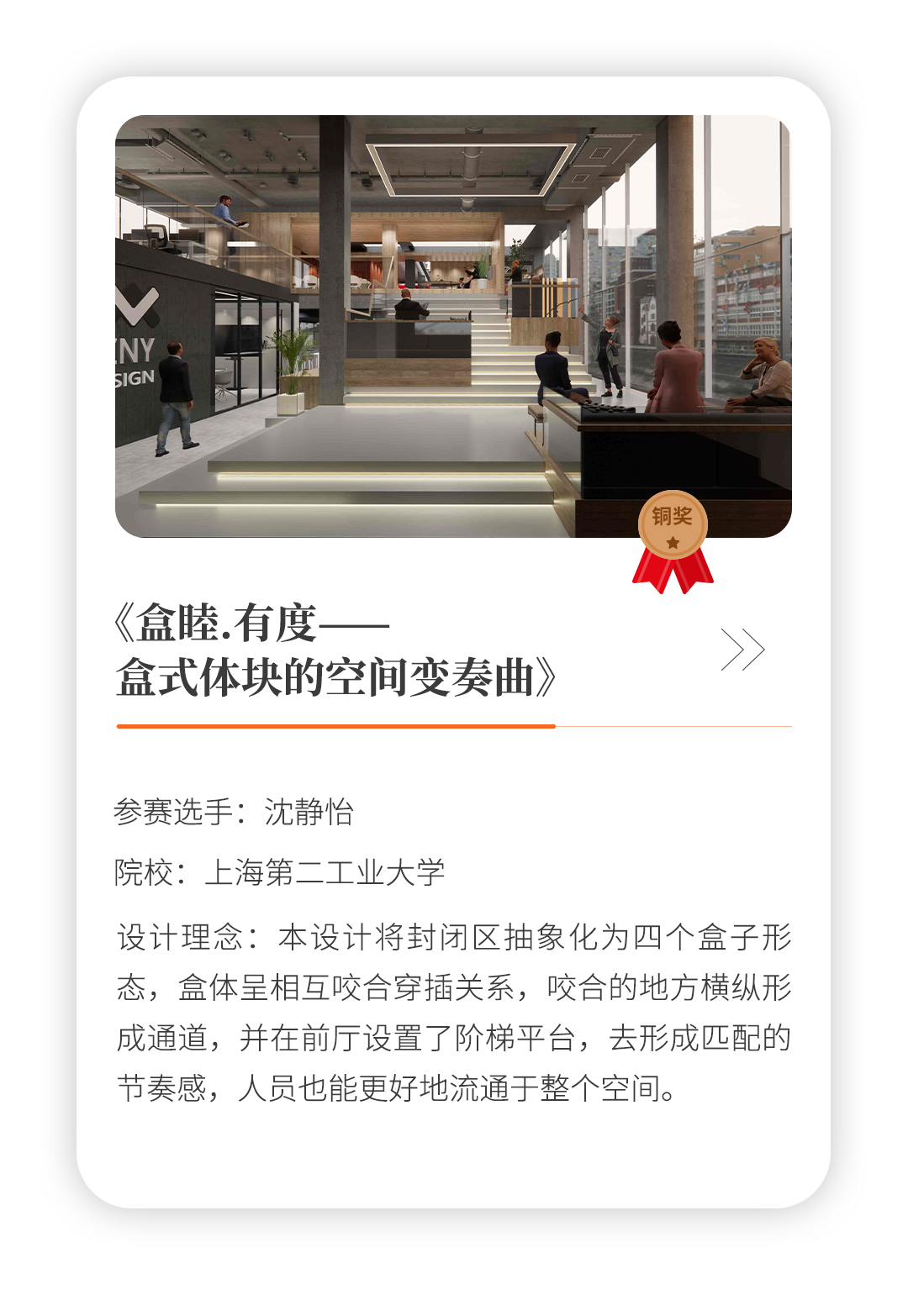 該作品提取《盜夢空間》中經典的夢境的世界觀,以層層嵌套的夢境為深入線索,運用具象與抽象相結合、空間內部與空間邊界虛實變化等方式,塑造出一個遠離真實世界的第三世界——沉浸式酒吧。作品通過獨特的空間結構、色彩與材質的創意性突破,營造出了一個有利于身心放松的室內空間環境,希望客人們在一天的繁忙勞碌之后走進酒吧,能夠像進入夢鄉沉浸于夢中那般的愉悅,與空間進行更深層次的交互,充分展示了出未來理想人居空間的藍圖。