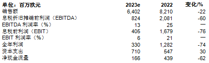 綜合上述因素,本期息稅前利潤(rùn)(EBIT)初步預(yù)計(jì)下降76%,減至約4.05億歐元(2022年:16.8億歐元),折舊和攤銷(xiāo)額約為4.18億歐元,較上年(4.02億歐元)略有增加。2023年全年利潤(rùn)約3.30億歐元(2022年:12.8億歐元)。