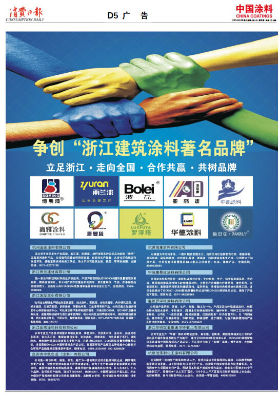 《中國涂料報》(電子版)的一切內容(包括但不限于文字、圖片、PDF、圖表、標志、標識、商標、版面設計、專欄目錄與名稱、內容分類標準以及為讀者提供的任何信息)僅供中國涂料信息網讀者閱讀、學習研究使用,未經中國涂料雜志社有限公司及/或相關權利人書面授權,任何單位及個人不得將《中國涂料報》(電子版)所登載、發布的內容用于商業性目的,包括但不限于轉載、復制、發行、制作光盤、數據庫、觸摸展示等行為方式,或將之在非本站所屬的服務器上作鏡像。否則,中國涂料雜志社有限公司將采取包括但不限于網上公示、向有關部門舉報、訴訟等一切合法手段,追究侵權者的法律責任。