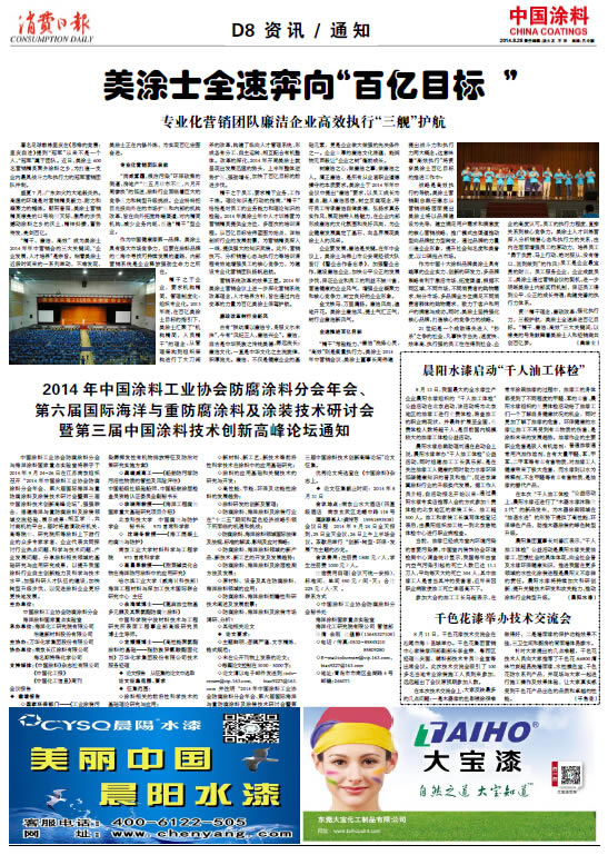 《中國涂料報》(電子版)的一切內容(包括但不限于文字、圖片、PDF、圖表、標志、標識、商標、版面設計、專欄目錄與名稱、內容分類標準以及為讀者提供的任何信息)僅供中國涂料信息網讀者閱讀、學習研究使用,未經中國涂料雜志社有限公司及/或相關權利人書面授權,任何單位及個人不得將《中國涂料報》(電子版)所登載、發布的內容用于商業性目的,包括但不限于轉載、復制、發行、制作光盤、數據庫、觸摸展示等行為方式,或將之在非本站所屬的服務器上作鏡像。否則,中國涂料雜志社有限公司將采取包括但不限于網上公示、向有關部門舉報、訴訟等一切合法手段,追究侵權者的法律責任。